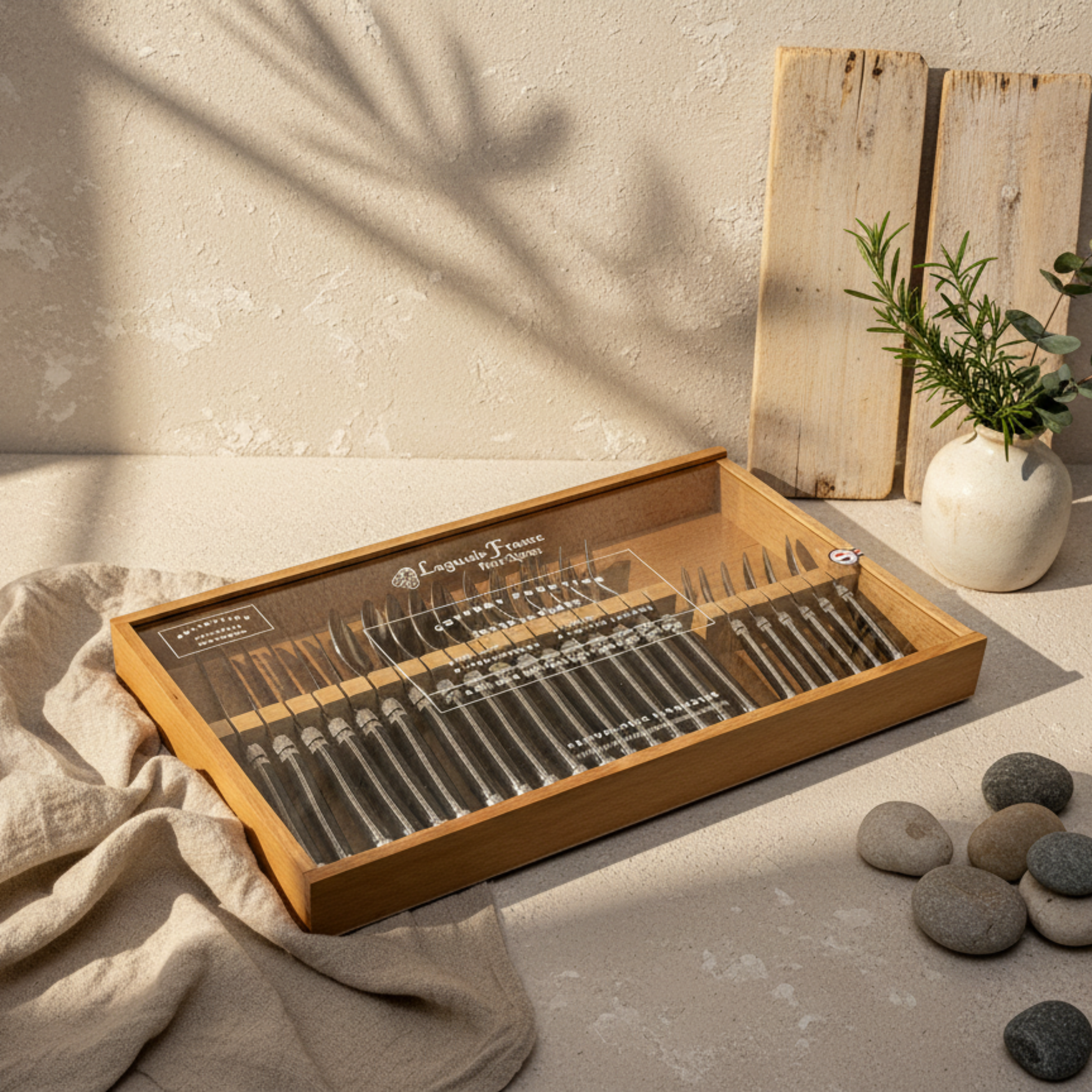 Laguiole 24 Piece Flatware Set, Platine Black in Wood Box with Acrylic Lid