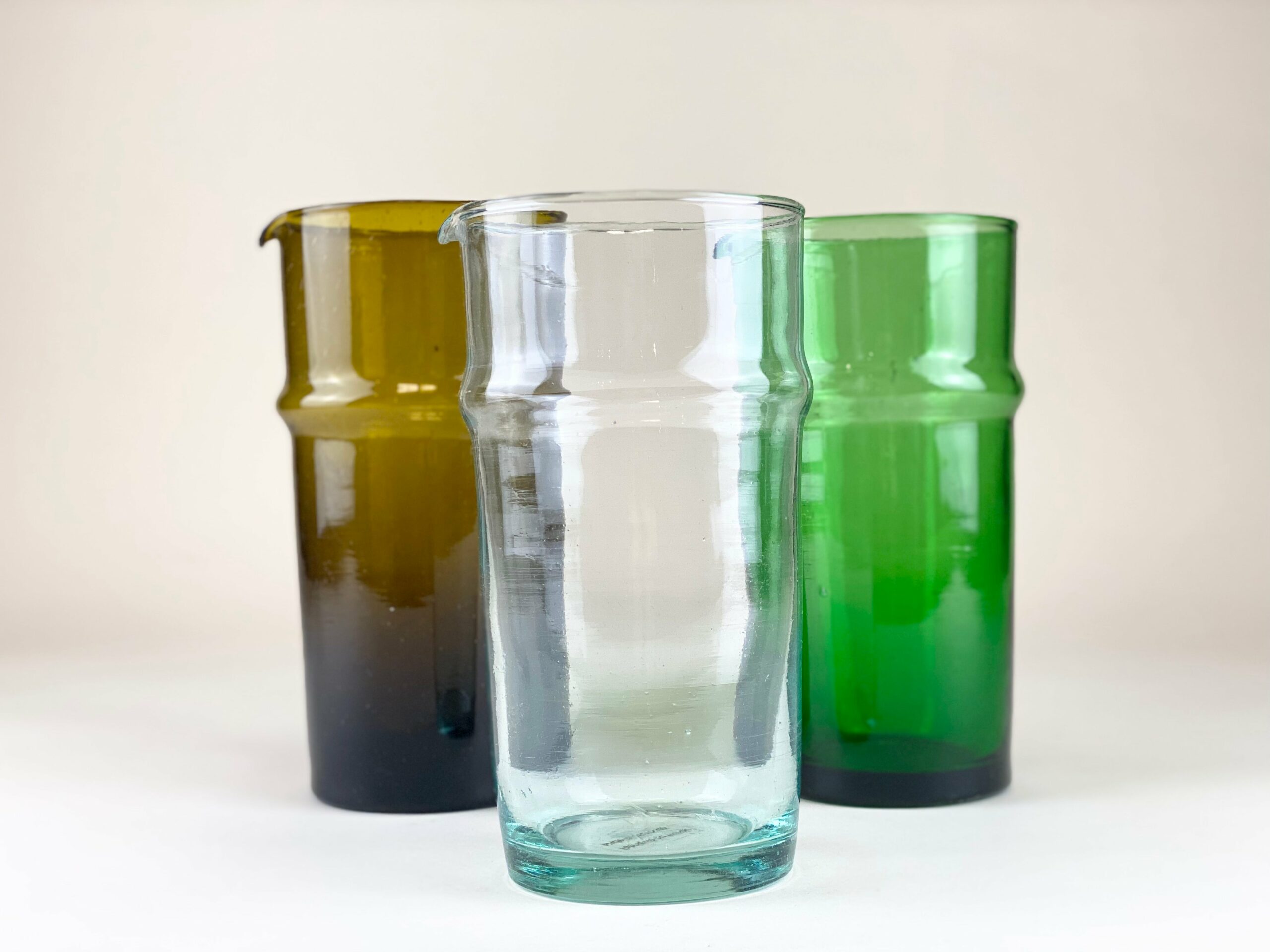 A genuine Moroccan institution, the beldi glass has been the tea glass of all local families since 1949, the year of its creation. This particular style is recognizable thanks to the raised ridge that allows for handling even when serving hot tea. Kessy Beldi glass is mouth blown from recycled cola and beer bottles, so each piece is unique and shows signs of the handmade process in slight bubbling and organic shapes. Each glass is fired at 1000° C (1832° F) then soaked in a cooling furnace, making for an extremely resistant end product. Three available colors, made in Morocco.
