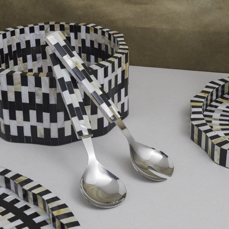 Experience the captivating artistry of the Finlay & Lyra collection with the striking Finlay Inlay Bowl. This exquisite piece skillfully blends high-contrast materials and striking geometric patterns, combining acacia wood, mother of pearl, and resin to create a modern interpretation of traditional inlay.
