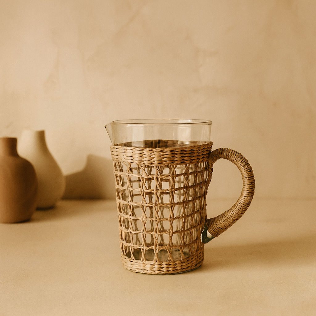 Seagrass meets glassware in this collection, which is an update on an old favorite. Natural wraps on pitchers and matching glassware make festive pieces for indoor and outdoor drinking and dining.