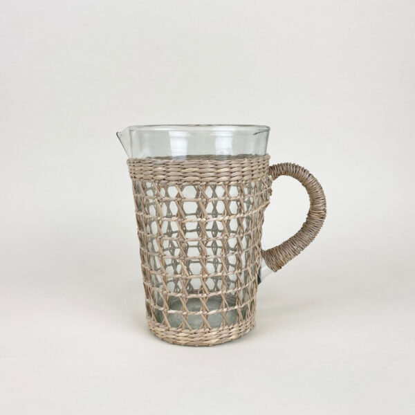Classic pitcher with pour spout and handle. Caged detailed seagrass wrapping covers all but top.