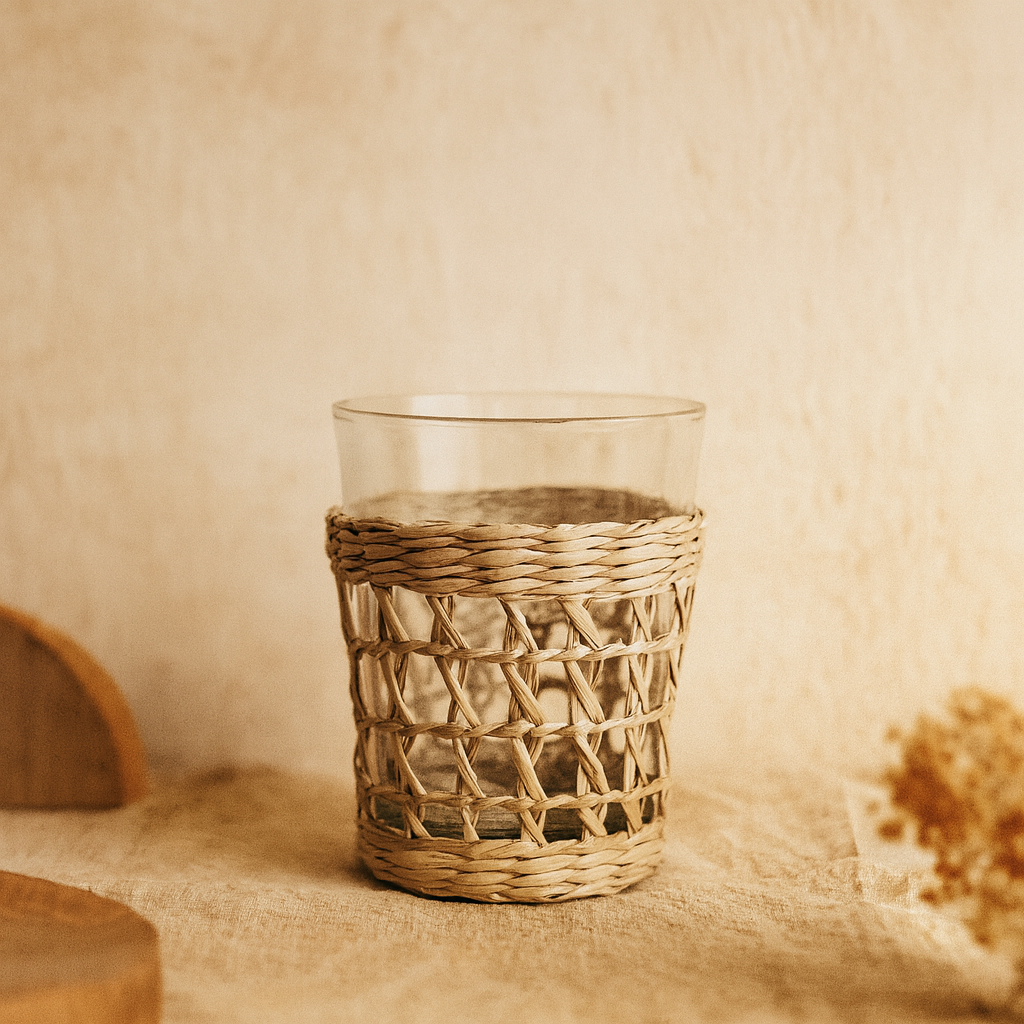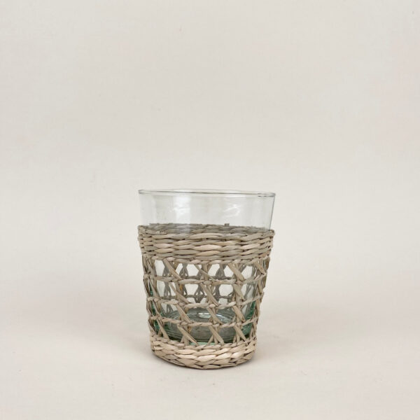 Wide tumbler glass. Removable seagrass wrapping. Charming size for a cocktail or dessert. Pairs well with the Indochine Cage Pitcher (as shown in second picture)